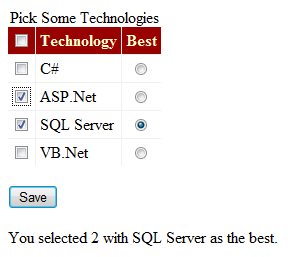 I have a page where the user can select which users are active (using CheckBoxes), and also select one (only one) to be the administrator. I put together this sample to show how I did it. The sample uses technologies instead of user. The picture below gives you an idea. I didn’t want to use the GridView “selected row” functionality because I didn’t want to do a PostBack and I have another project where the user has to select 1 row per day where a day can take up 3 to 10 rows and there were many days in the grid.