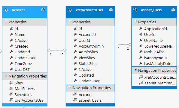 The converter is where we count up the number of entities in the related entity set (xrefAccountsUsers in this case.) I could not find a type that I could cast the value to that had a Count property, so I ended up casting it to IEnumerable and then loop thru the set and I do a count manually. There should never be very many accounts so performance isn’t an issue.